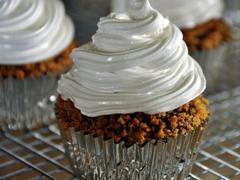 3. Transfer cupcakes to a baking sheet. Using a kitchen torch, lightly brown the frosting, taking care not to burn the cupcake liners. Serve immediately or store in an airtight container, up to 2 days.